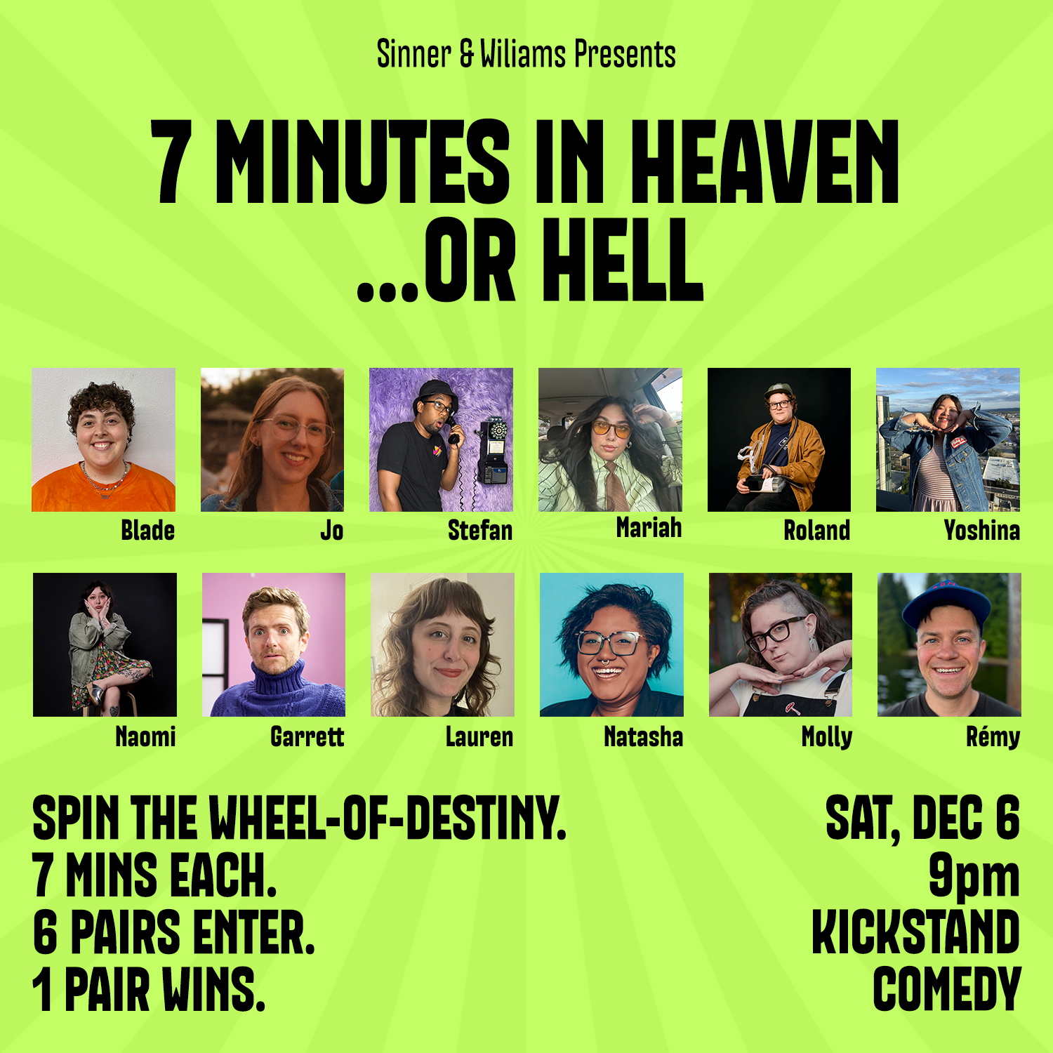 Join Sinner & Williams (your devilish & angelic hosts) for a chaotic night of duos, prizes, and more! The audience will randomly choose 2 people to pair up for a 7 minute scene—the only catch—they have to spin the Wheel-of-Destiny to see their fate. Some options are heavenly while others are hellish. If your duo wins, you get a prize!
