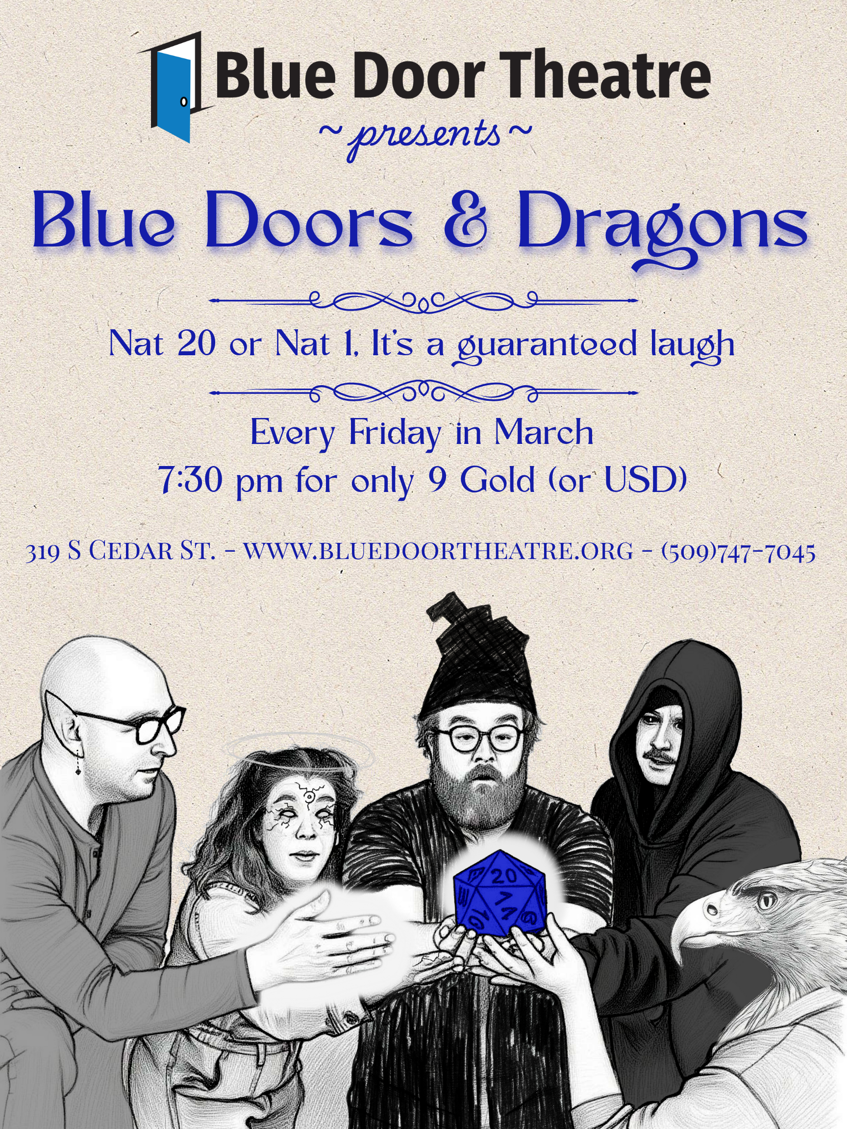 Adventure has called the Blue Door Theatre and we are answering with no preparation whatsoever. Blue Doors and Dragons is back blending improv comedy with the epic journeys of role-playing games (RPG), led by our Game Master, who narrates the story, creates the world around our heroes, and interprets every dice roll. Watch our heroes battle monsters, navigate strange lands, and panic when the dice inevitably betray them.