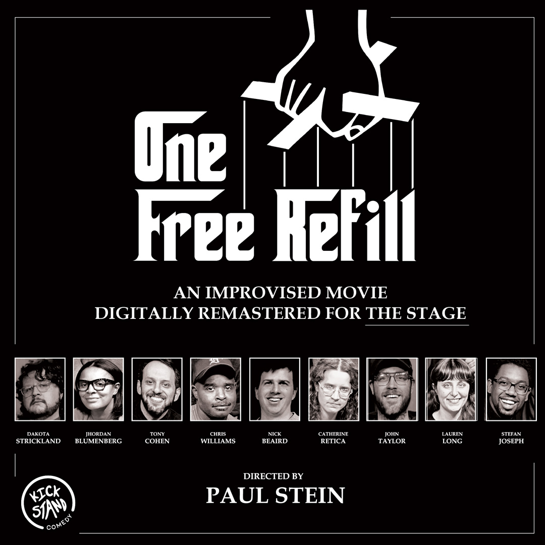 From an audience suggestion, a fully improvised movie is made up and created on the spot by the ensemble, One Free Refill.