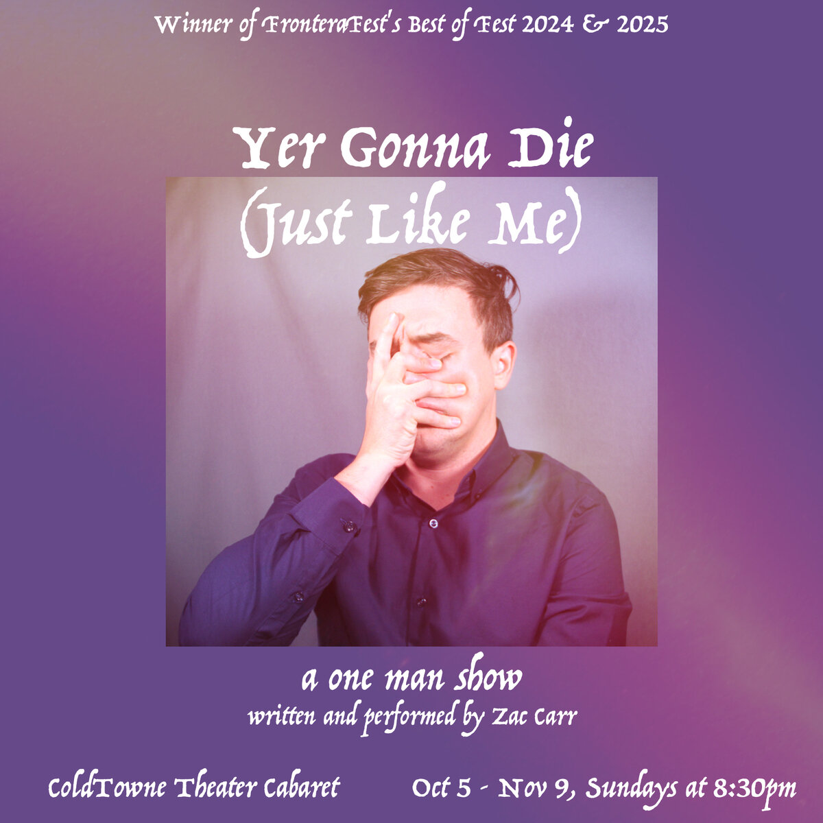 Yer Gonna Die (Just Like Me) is a one man show written and performed by Zac Carr and a winner of Best of Fest at FronteraFest 2024. Based on the works of certified theatre genius Dennis Lobsky and his founding of the School of Dead Acting. A tour-de-farce performance, part sketch, part theater, and part master class on playing dead.